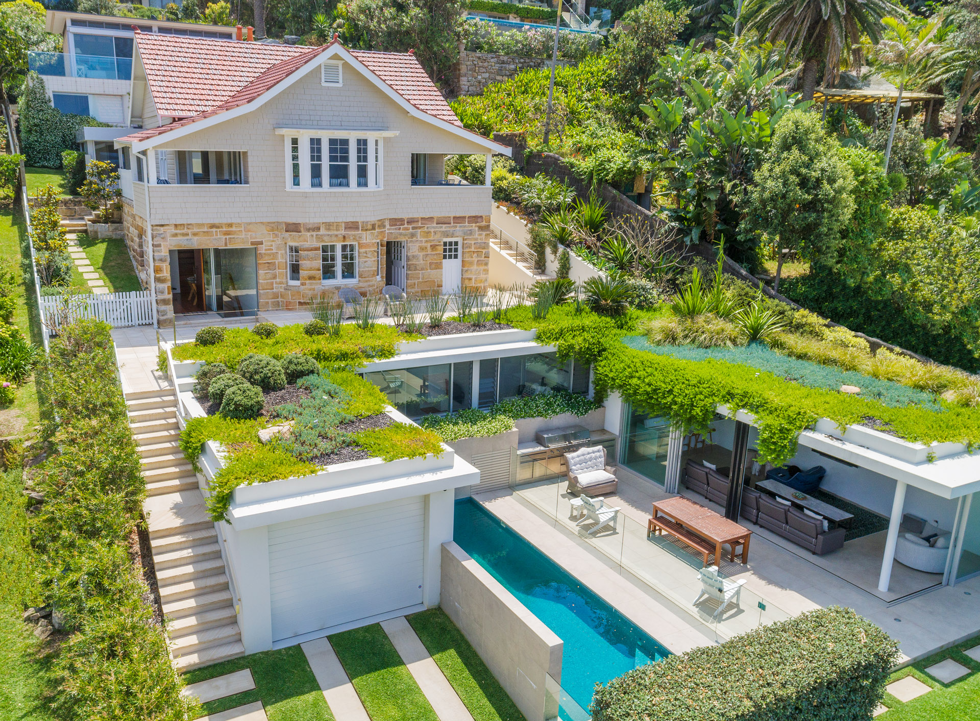 The position of the original house on the site meant that only limited accommodation could be added behind which lead to the addition of a new level buried into the front lawn with an expansive ‘green roof’ above. This approach allowed the original home to remain centre-stage in a garden setting and for the new living areas and pool to share the spectacular views and position.