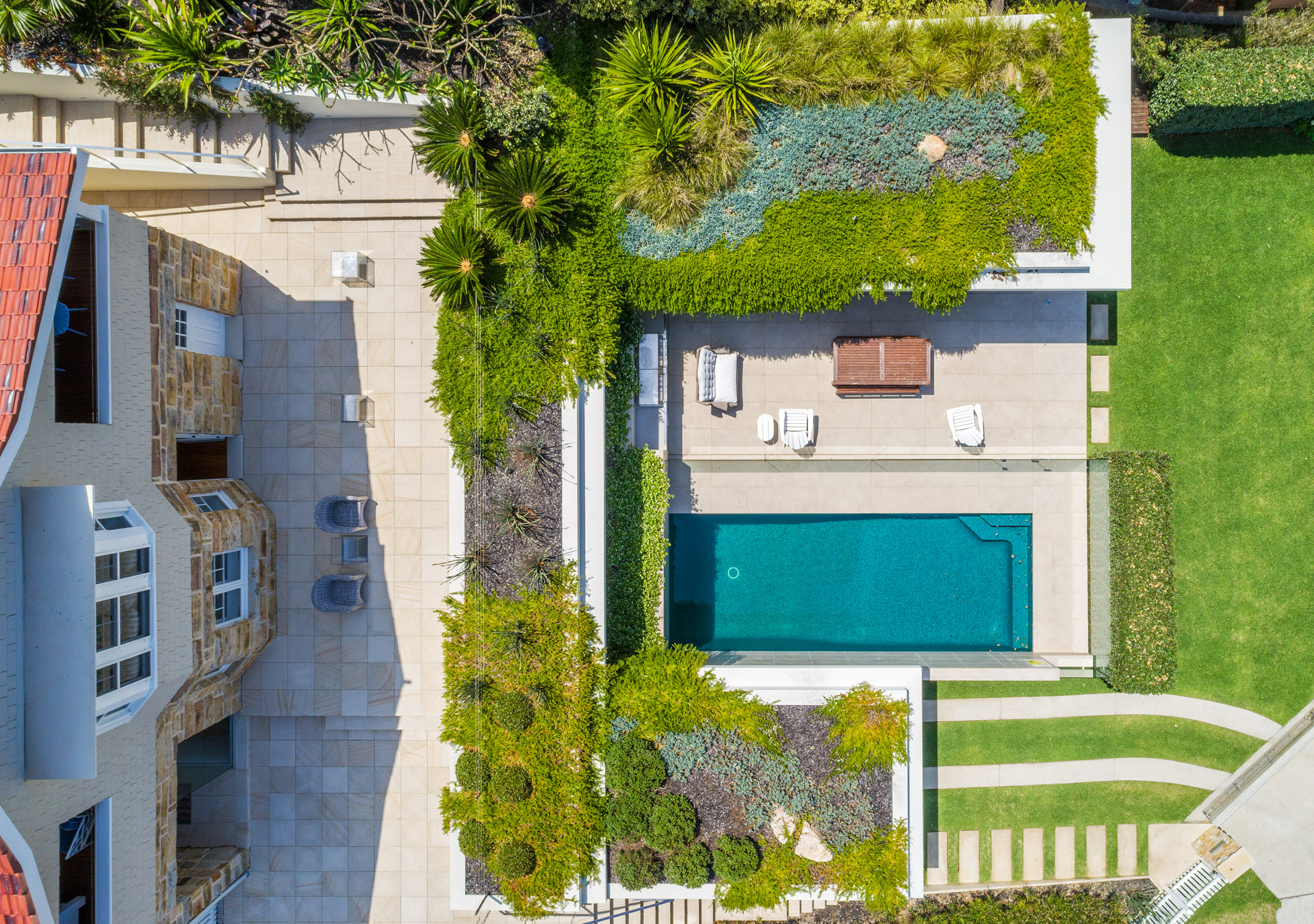 The position of the original house on the site meant that only limited accommodation could be added behind which lead to the addition of a new level buried into the front lawn with an expansive ‘green roof’ above. This approach allowed the original home to remain centre-stage in a garden setting and for the new living areas and pool to share the spectacular views and position.