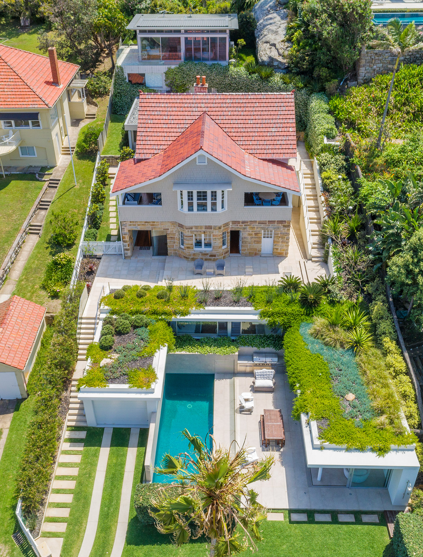 The position of the original house on the site meant that only limited accommodation could be added behind which lead to the addition of a new level buried into the front lawn with an expansive ‘green roof’ above. This approach allowed the original home to remain centre-stage in a garden setting and for the new living areas and pool to share the spectacular views and position.