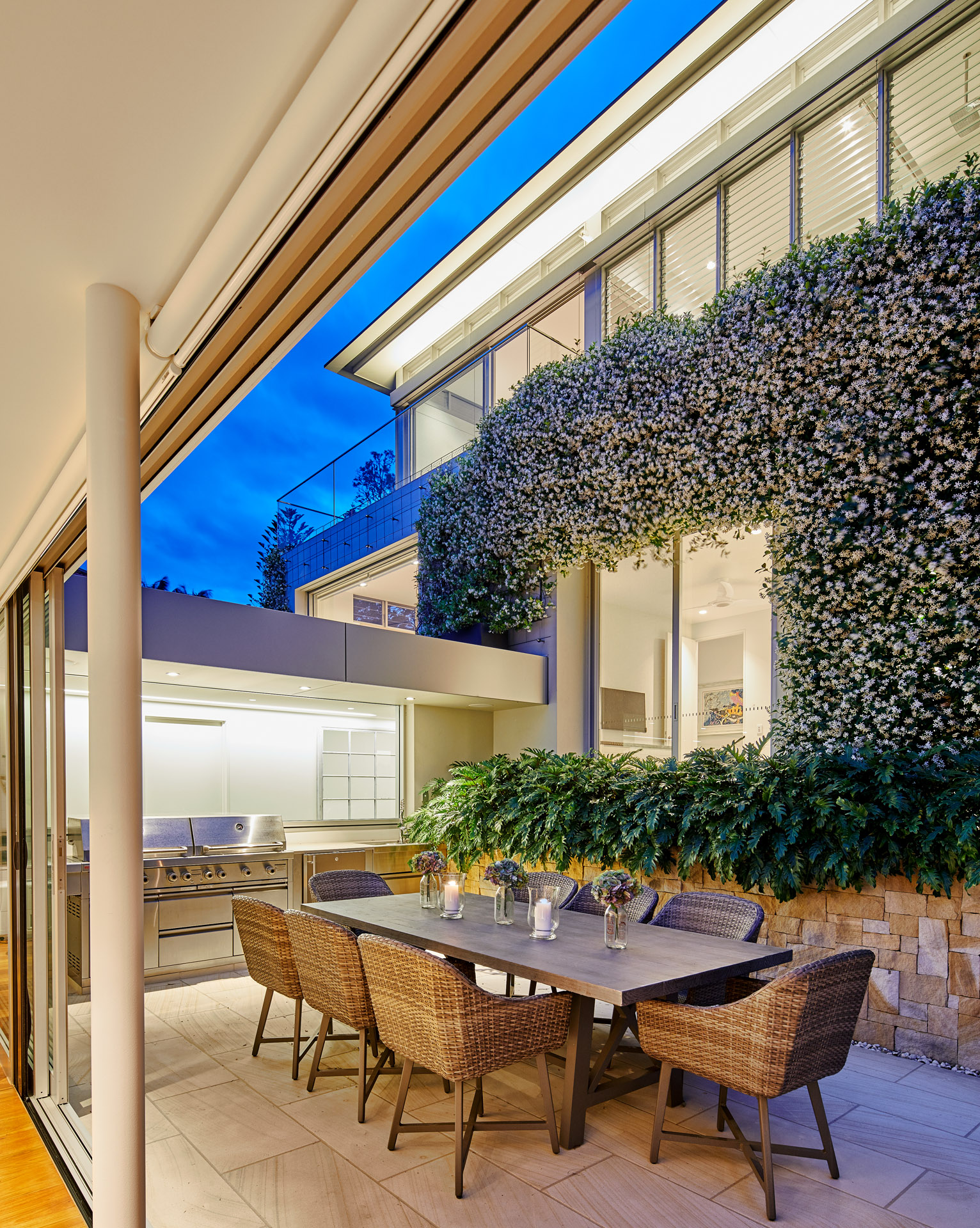The rear of the house opens up to a courtyard that receives north sun and provides a sheltered and private outdoor dining area adjacent to the original part of the home.