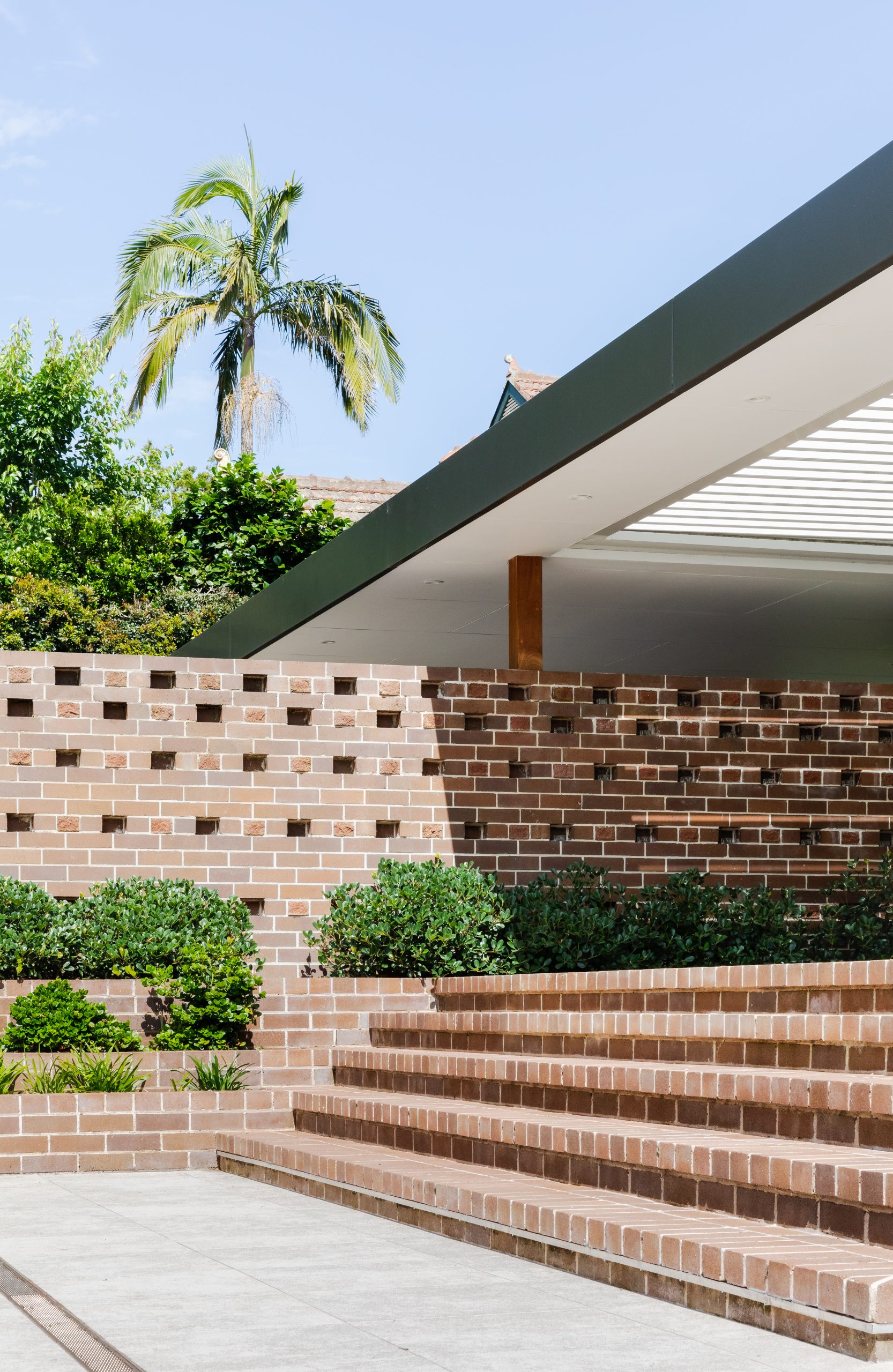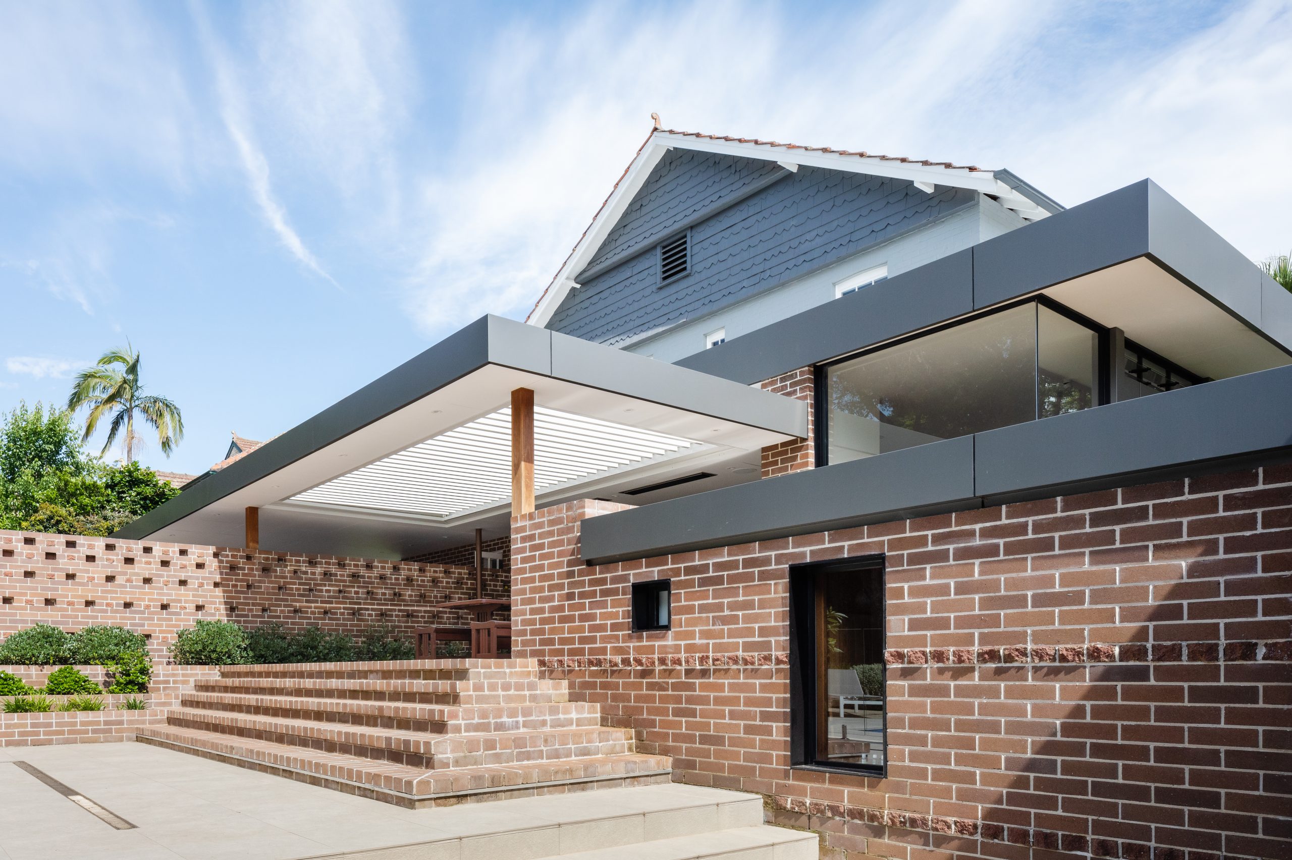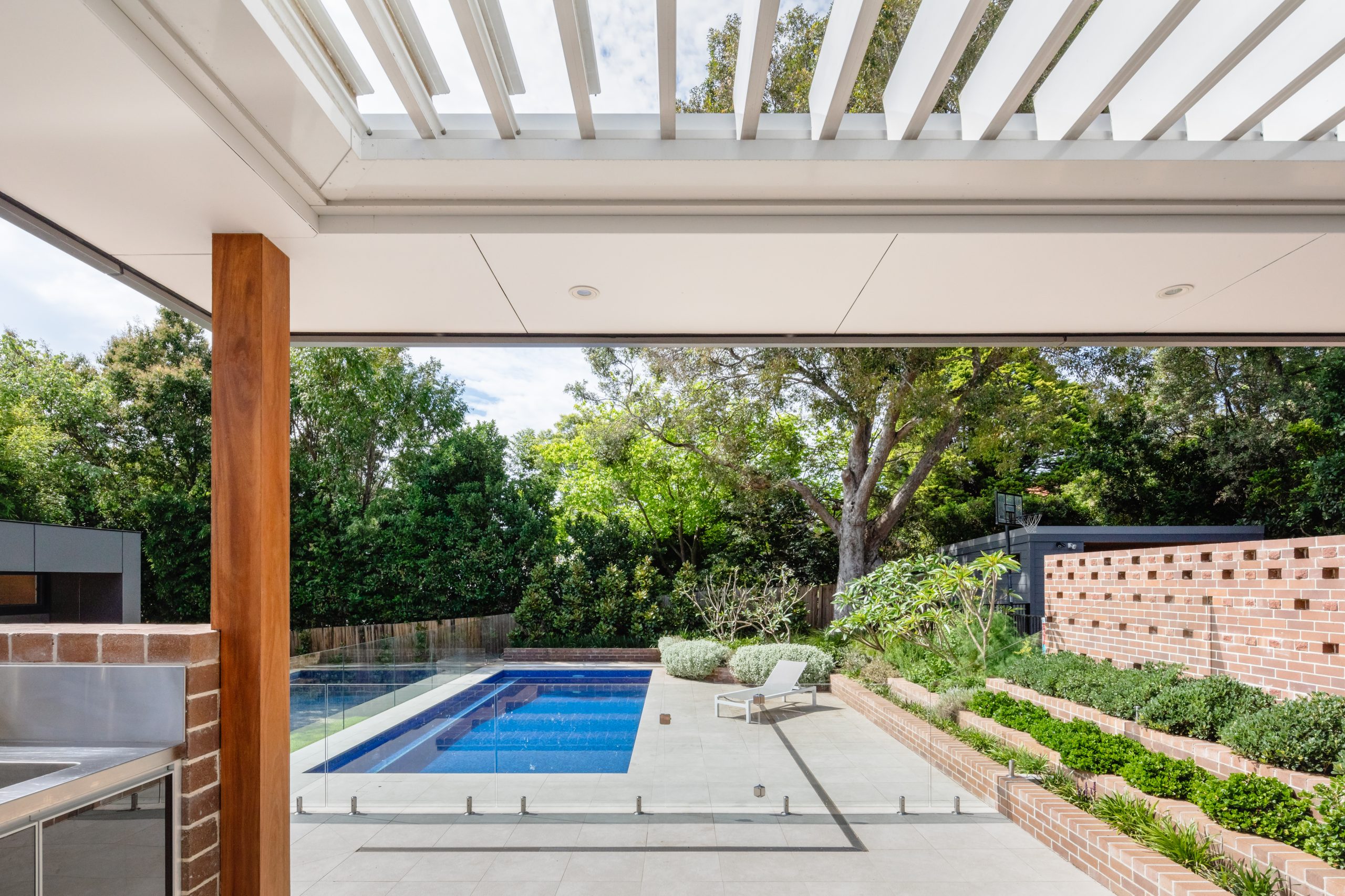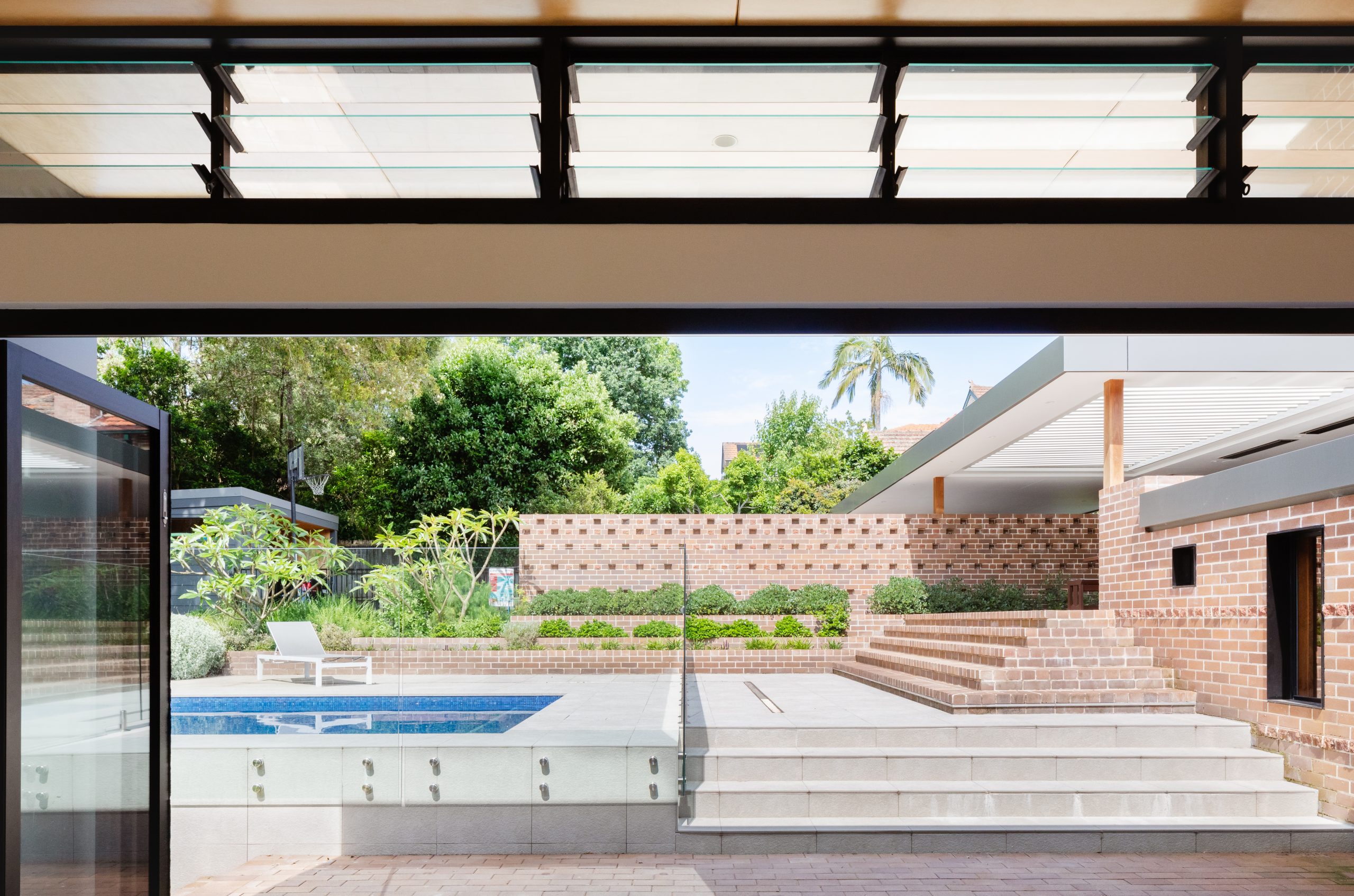 Our solution was to add a modern steel and glass pavilion, linked to the outdoor pool at garden level, and a new kitchen and outdoor entertaining area at the rear of the house. The two areas are unified using detailed brickwork and the flat roofs are subservient to the original house. A new brick screen wall hides the open carport and creates an outdoor room facing the pool and garden. The operable roof over the BBQ and dining area means it can be used all year round and in all weather. A wide set of brick stairs links the pool and garden to the main house.