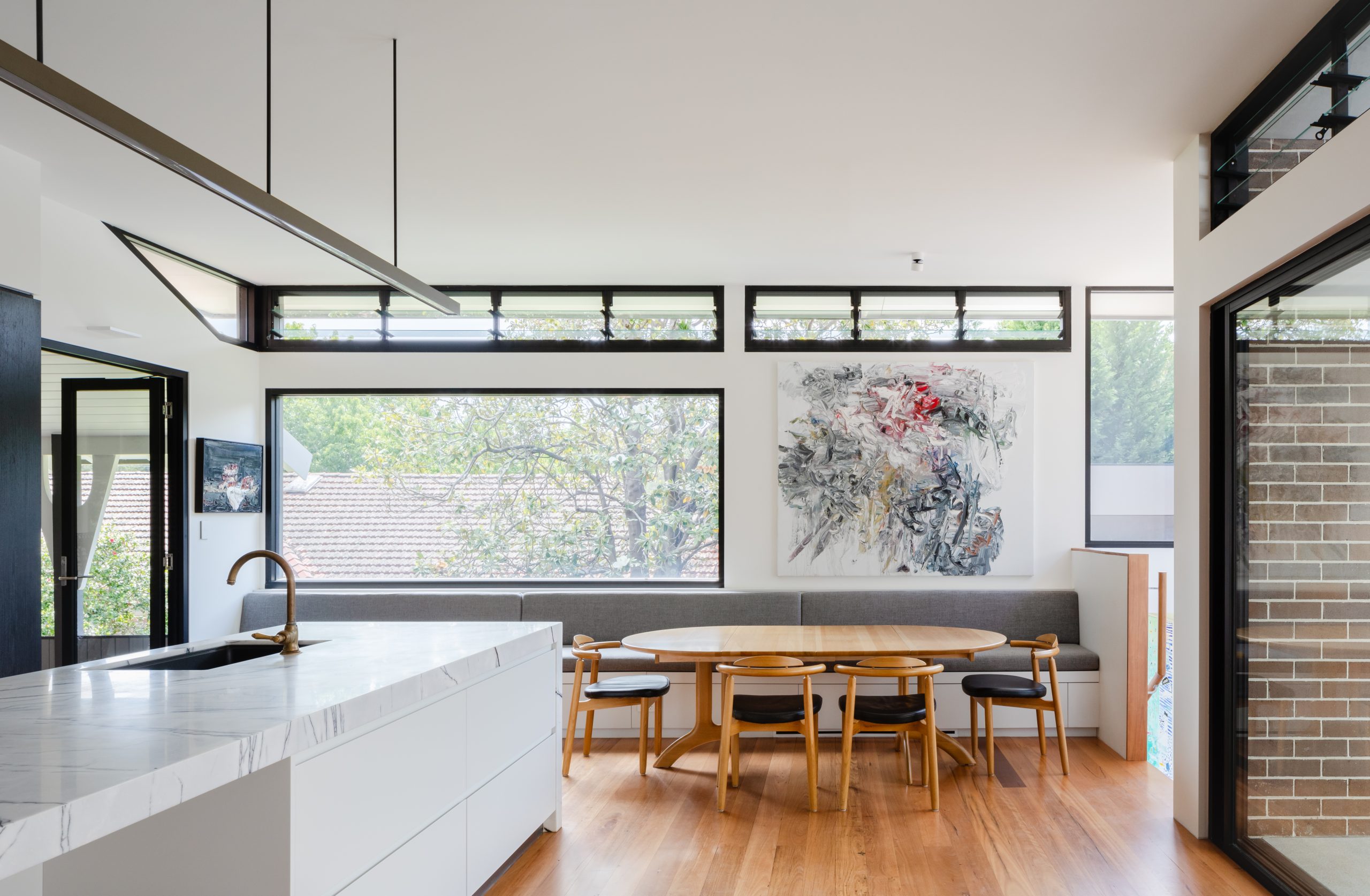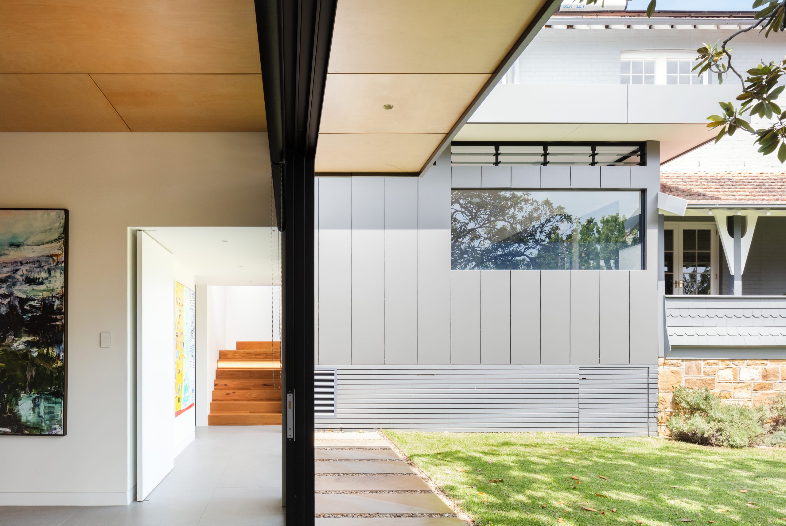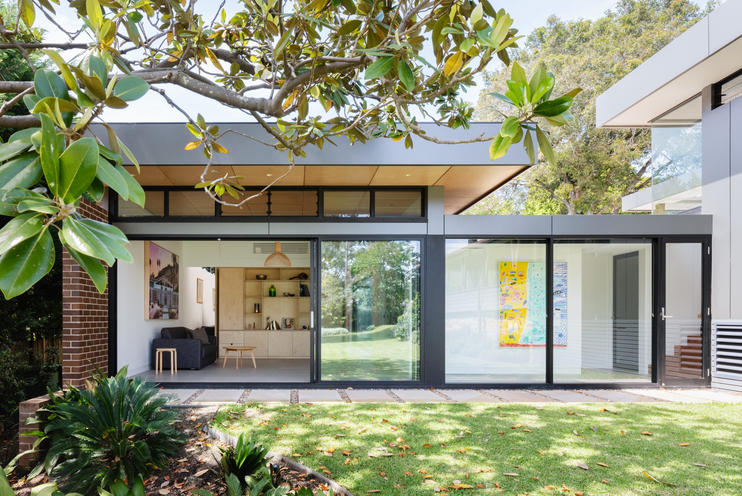 Our solution was to add a modern steel and glass pavilion, linked to the outdoor pool at garden level, and a new kitchen and outdoor entertaining area at the rear of the house. The two areas are unified using detailed brickwork and the flat roofs are subservient to the original house. A new brick screen wall hides the open carport and creates an outdoor room facing the pool and garden. The operable roof over the BBQ and dining area means it can be used all year round and in all weather. A wide set of brick stairs links the pool and garden to the main house.