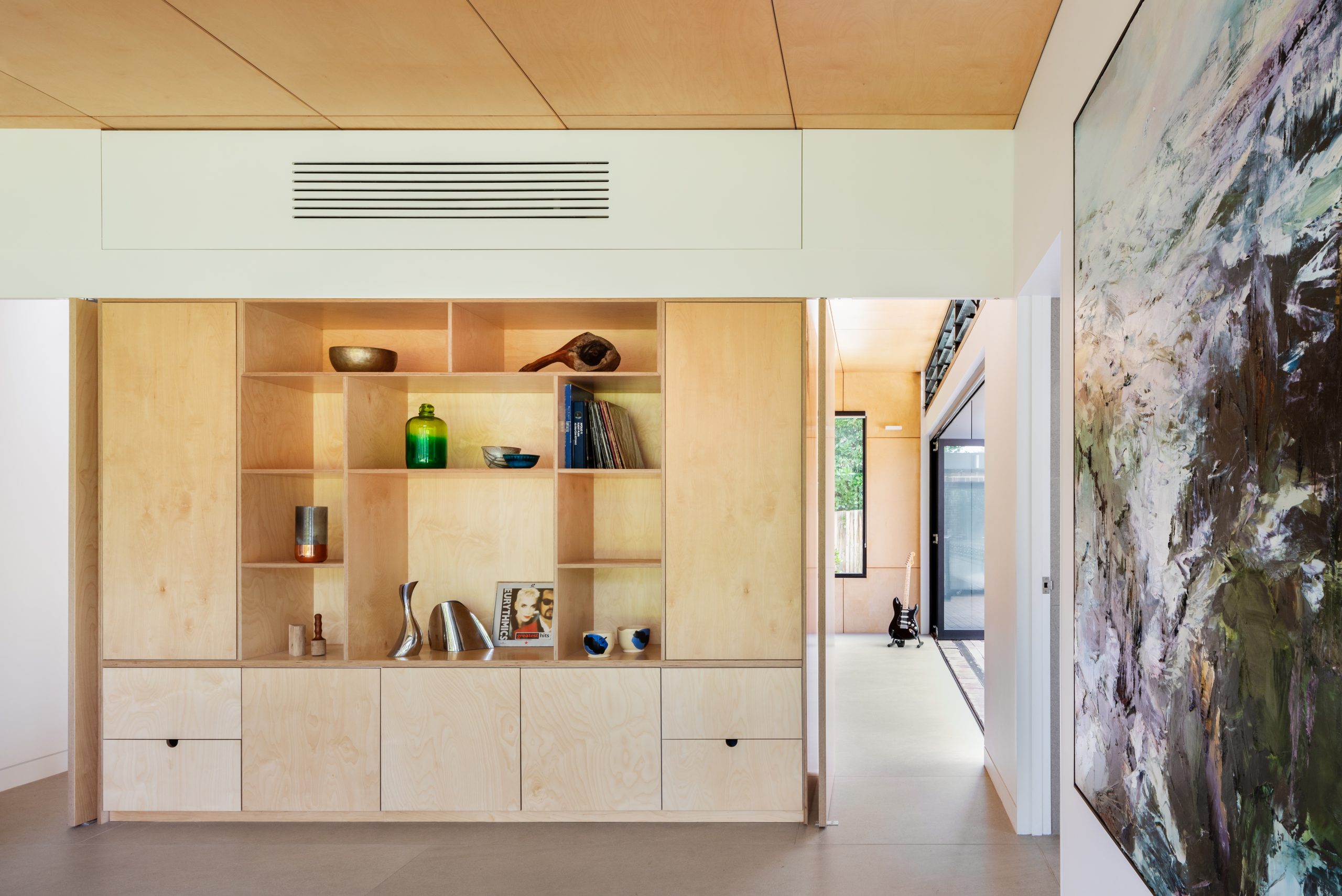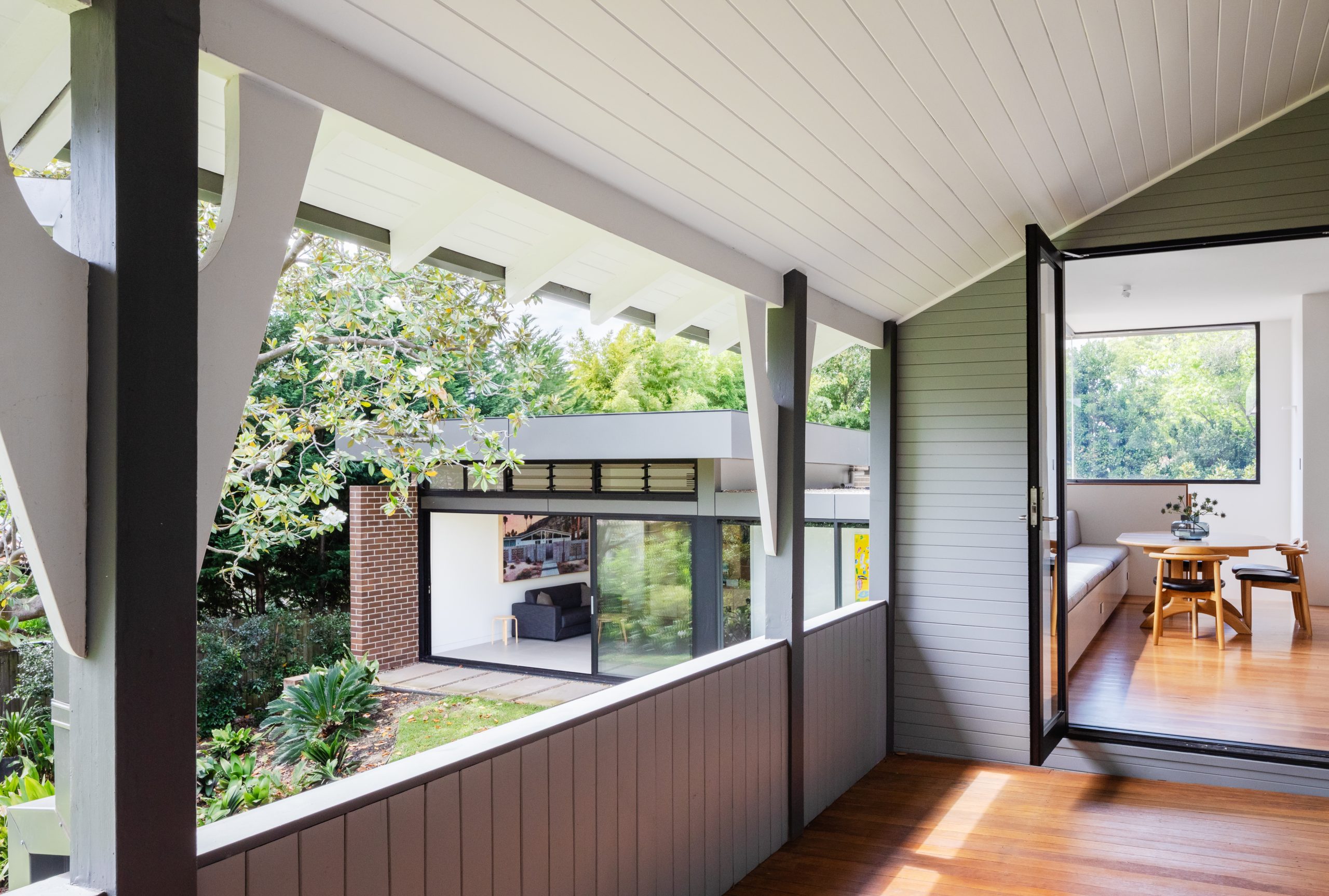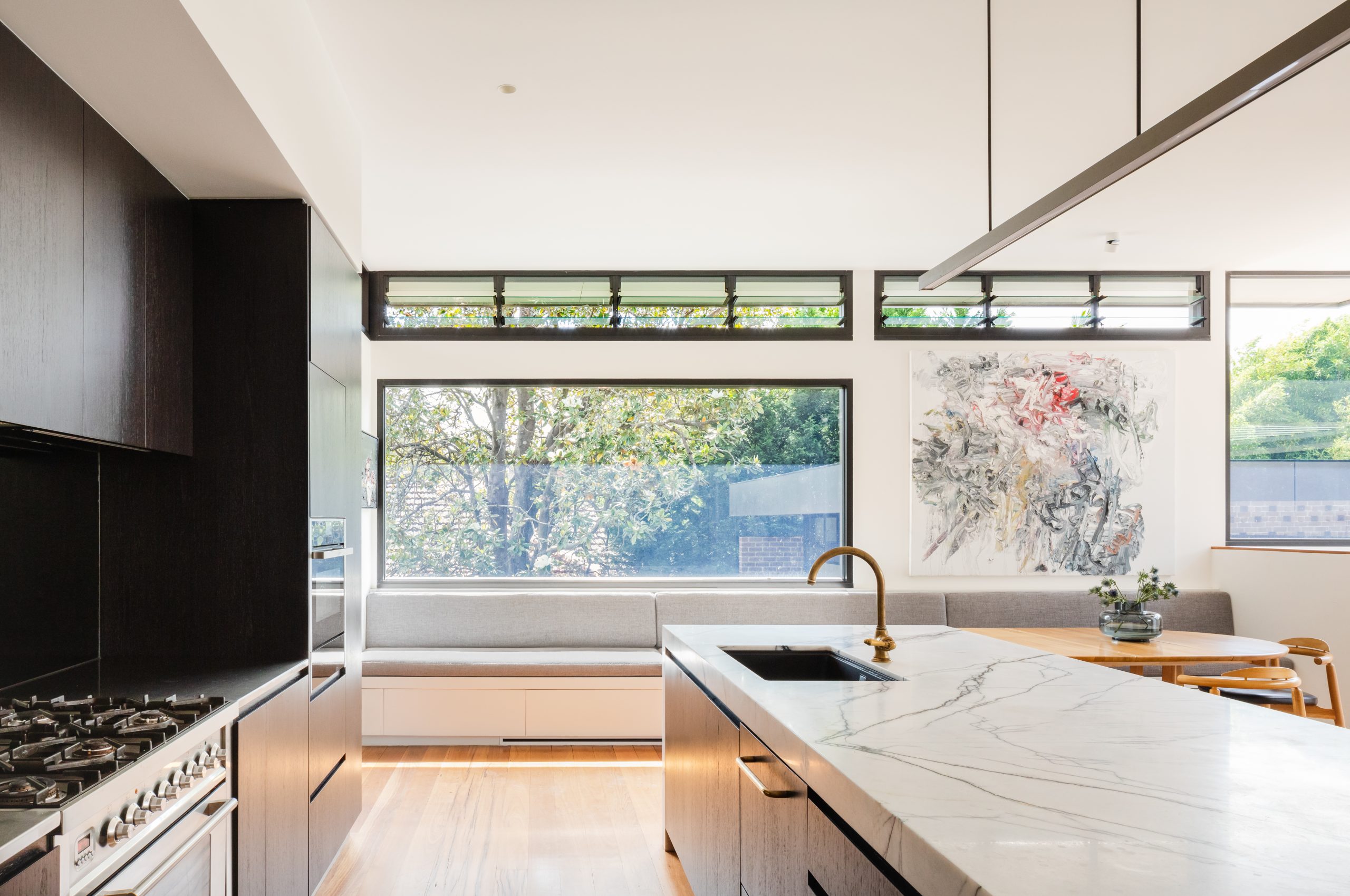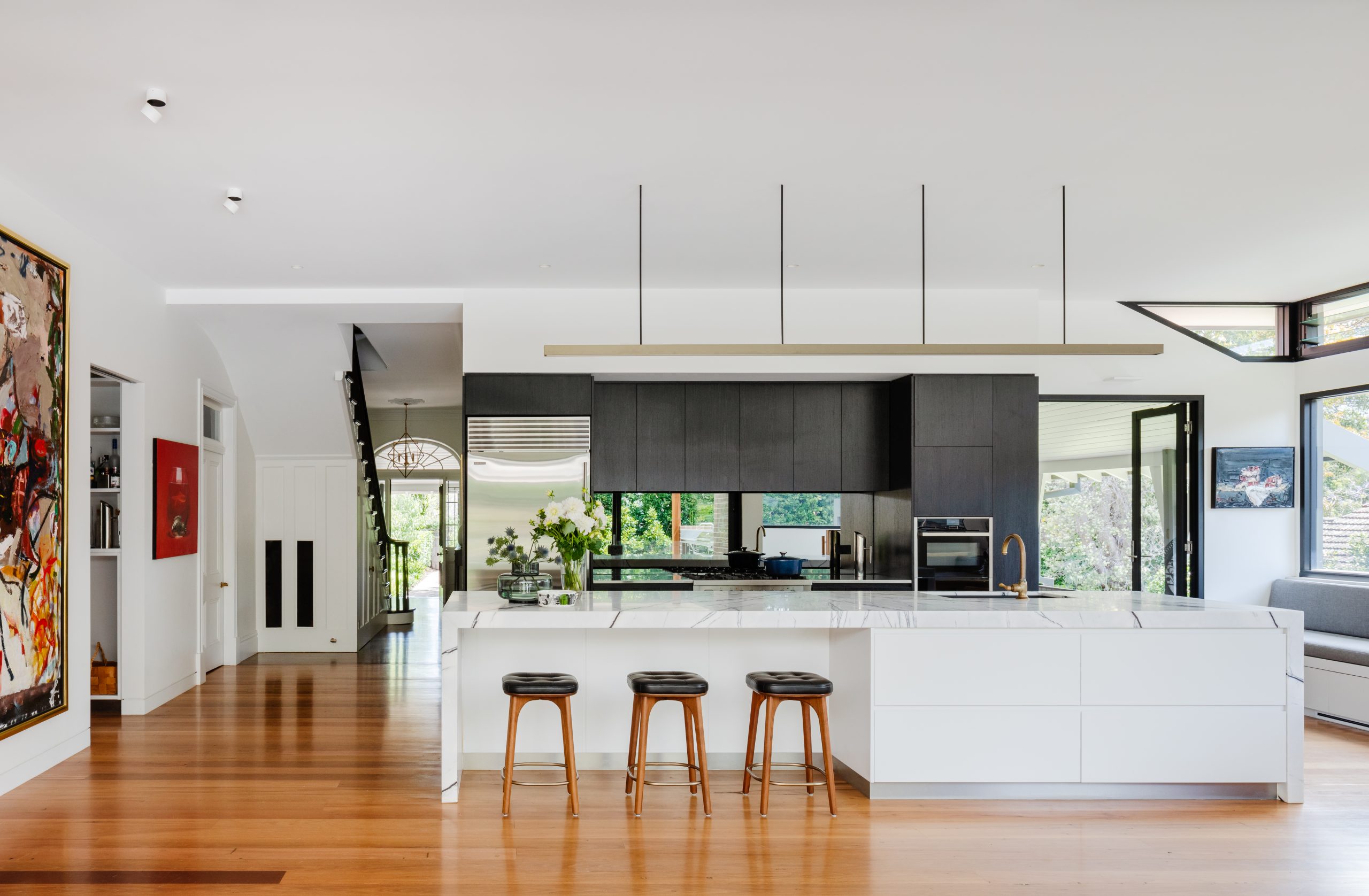 Our solution was to add a modern steel and glass pavilion, linked to the outdoor pool at garden level, and a new kitchen and outdoor entertaining area at the rear of the house. The two areas are unified using detailed brickwork and the flat roofs are subservient to the original house. A new brick screen wall hides the open carport and creates an outdoor room facing the pool and garden. The operable roof over the BBQ and dining area means it can be used all year round and in all weather. A wide set of brick stairs links the pool and garden to the main house.